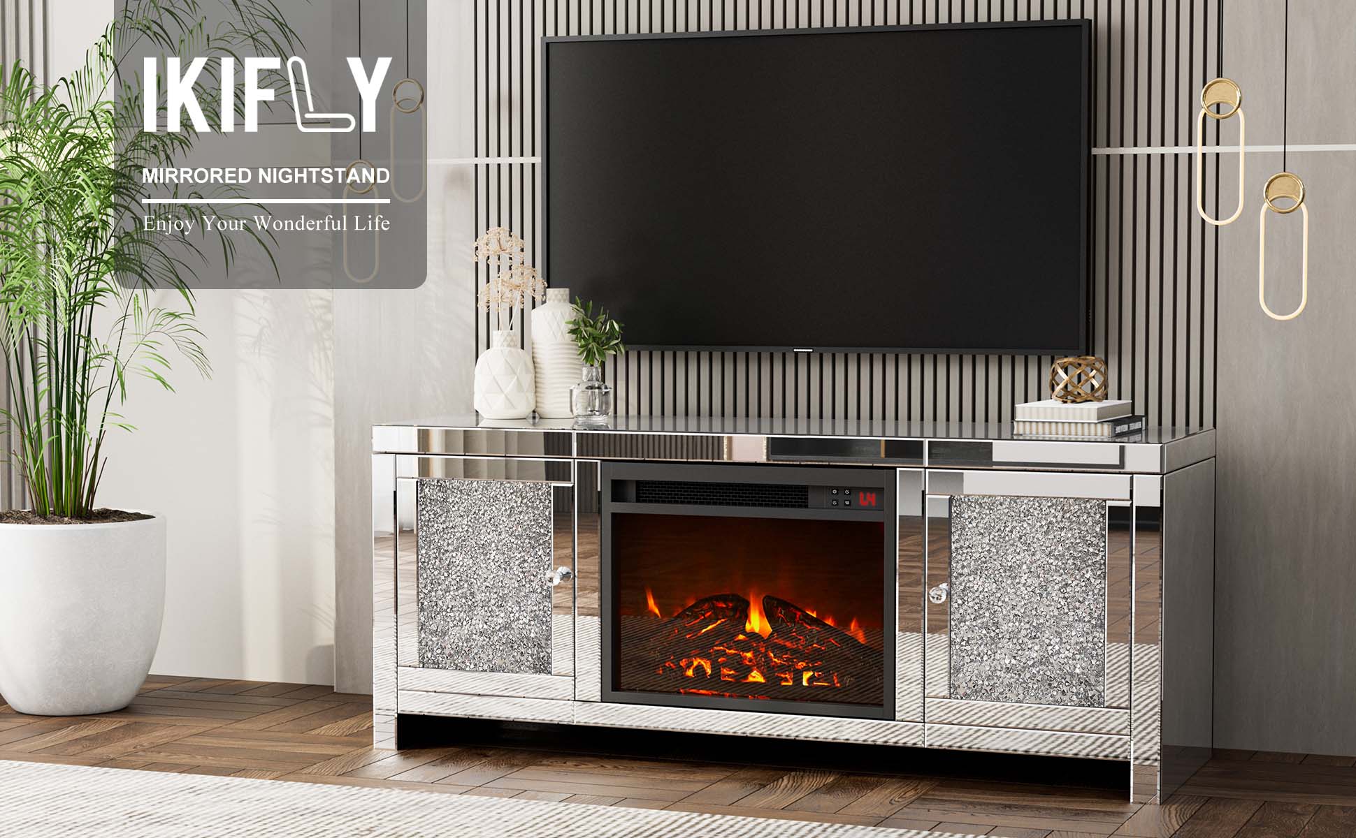 💎【Mirrored Electric Fireplace TV Stand】The fireplace designed with a fascinating mirror finish, decorating with faux crystal on both sides of the fireplace. Ultra High Intensity LED lights provide realistic flame effect. The 750W & 1500W heating device power modes can be adjusted accordingly for both warm and energy saving purpose.