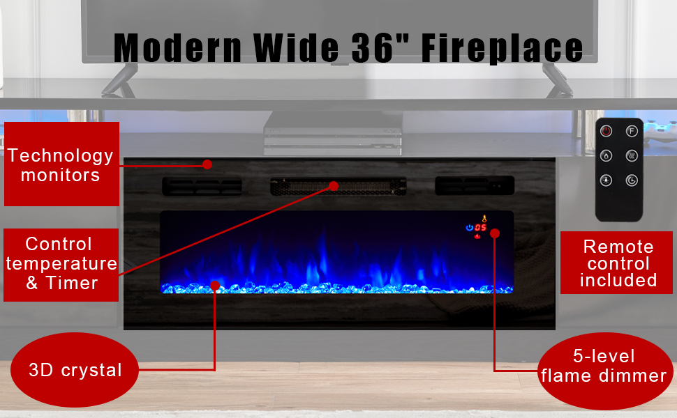 - 36″ wide modern electric fireplace features 3 color realistic flame&5 level brightness,temperature control and time setting.750W/1500W Power heats quicker & energy efficient for max 4800 BTU output.Remote control included.