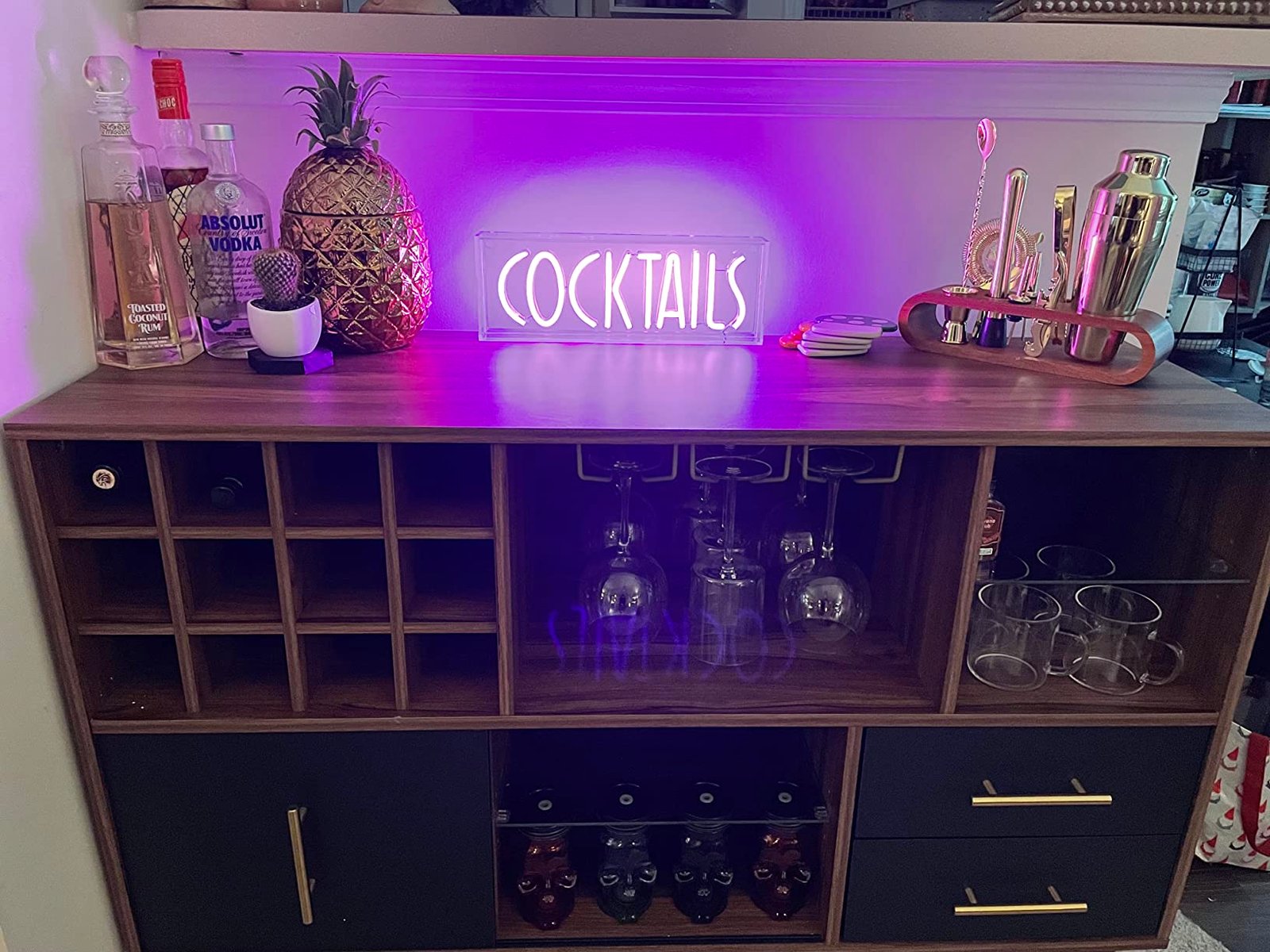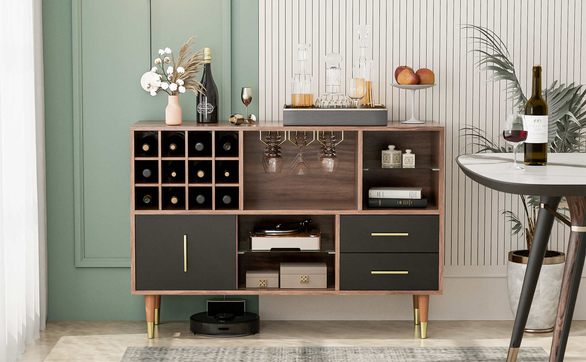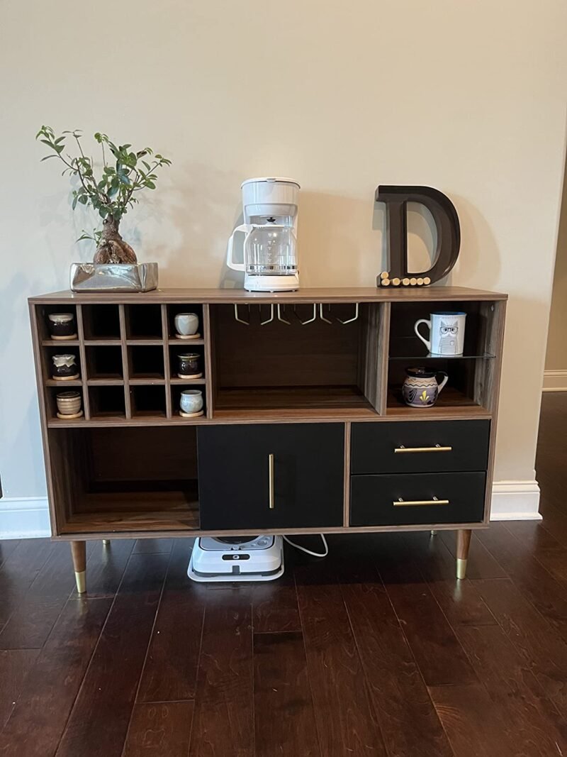 【DEDICATED STORAGE SPACE】 – The kitchen buffet specialized wine rack which can hold wine or drinks, 4 stemware holder, 2 open shelves and storage drawers, all in one sideboard, both openness and confidentiality. You can freely place items according to your needs.