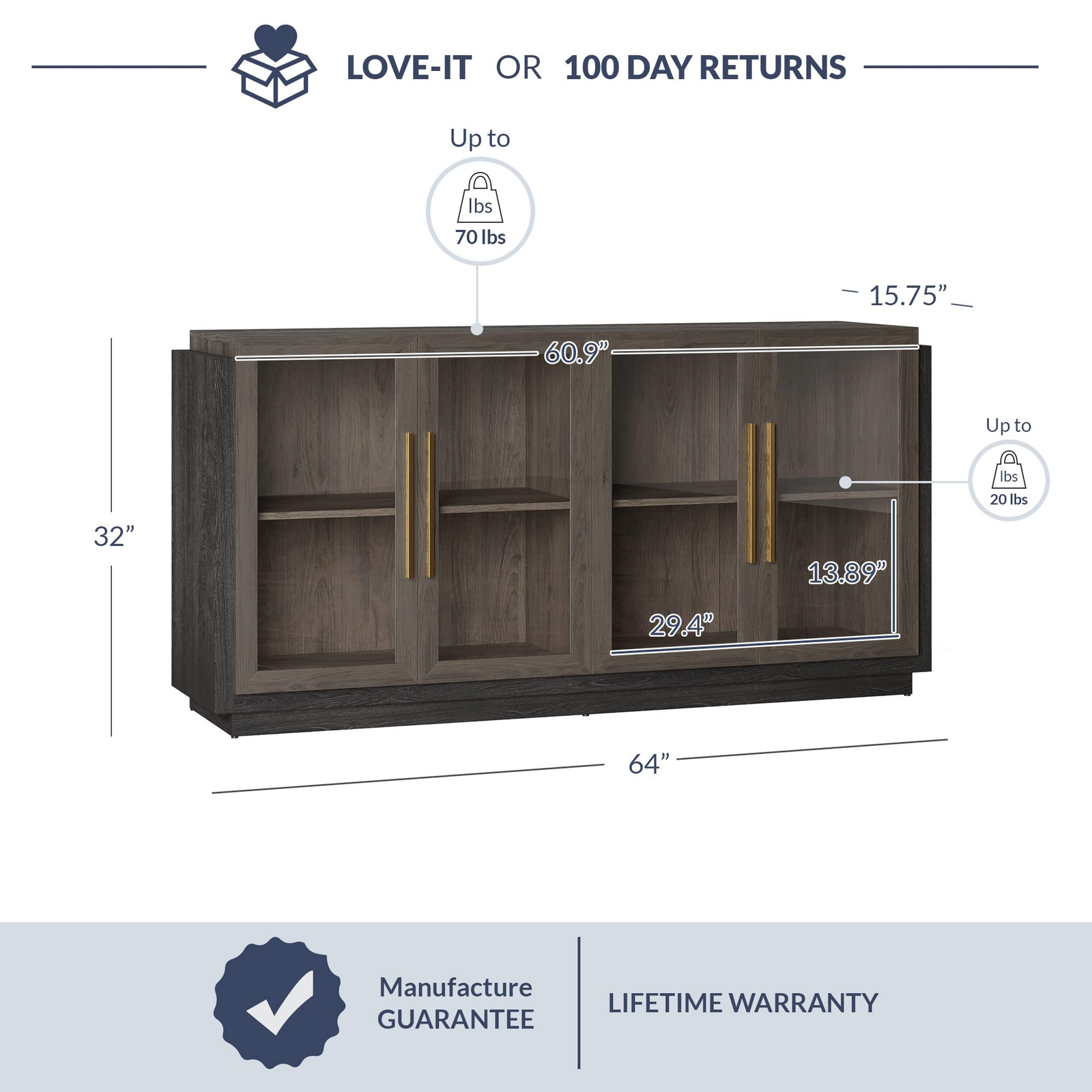 • [MODERN DESIGN] Stylish design with clean lines, mixed color accents, and golden alloy handles give this buffet cabinet a contemporary appeal with a decorative touch. Measures 64″L x 15.75″W x 32″H with a capacity of 70 lbs.