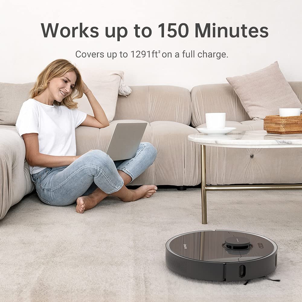 - 【4000Pa Strong Suction & 150 Mins Overlong Runtime】 The maximum suction power of 4000Pa suction easily lifts dirt from floors, 4 suction modes to choose from due to the degree of soiling; 150 minutes of non-stop cleaning can cover large homes in one single clean.