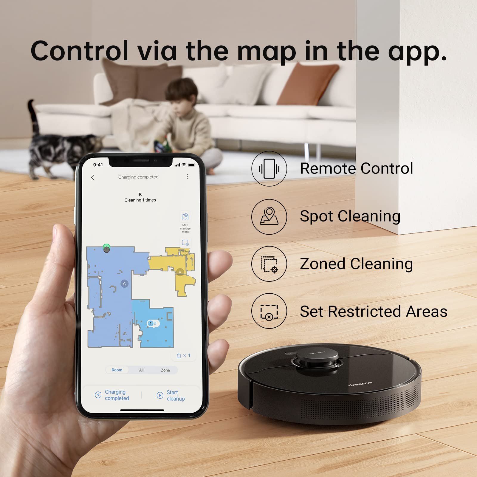 - 【Phone App and Voice Control】 Save multiple maps, divide or merge areas, label rooms, and set no-go zones so that certain areas will not be cleaned or mopped total controlled by MI App and Alexa voice control.