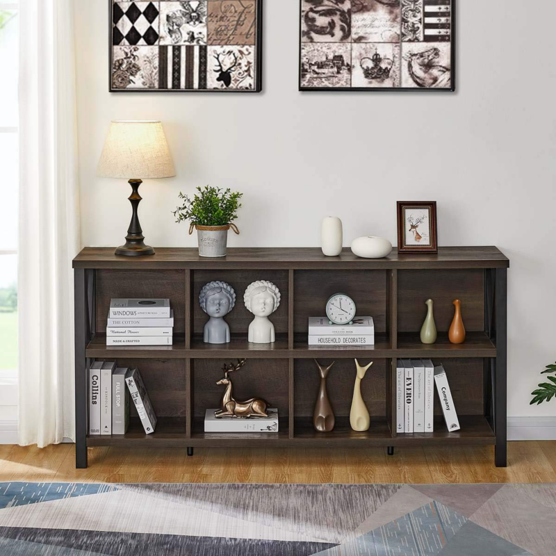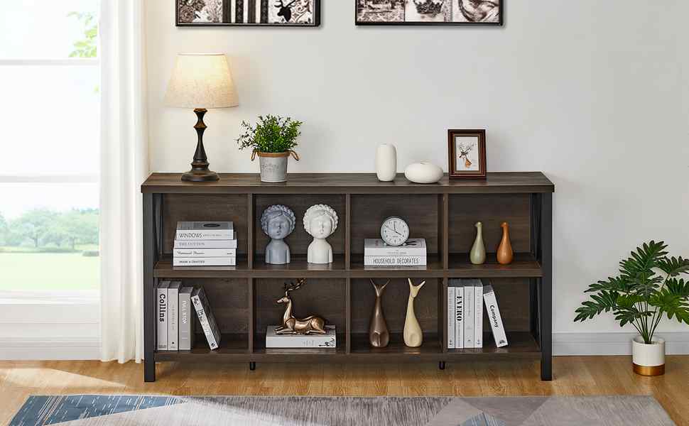 - [Industrial Rustic Design]: Brown slatted board and black metal frame flawlessly combined with modern and traditional style. Clean lines fuse with industrial flair to give this horizontal bookshelf a refreshing appearance that adds an on-trend touch to your room. Ideal solution for a quick, easy, and attractive organizational.