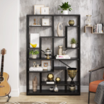 - [ Stable Sturdy Durable Bookcase]- Our modern staggered bookshelf is constructed by high quality E1 grade premium safe particle board and black metal frame. The robust mix of sturdy iron and hard-wearing engineered wood gives the tall vintage bookshelf a high degree of stability. Stable sturdy durable storage rack standing shelf