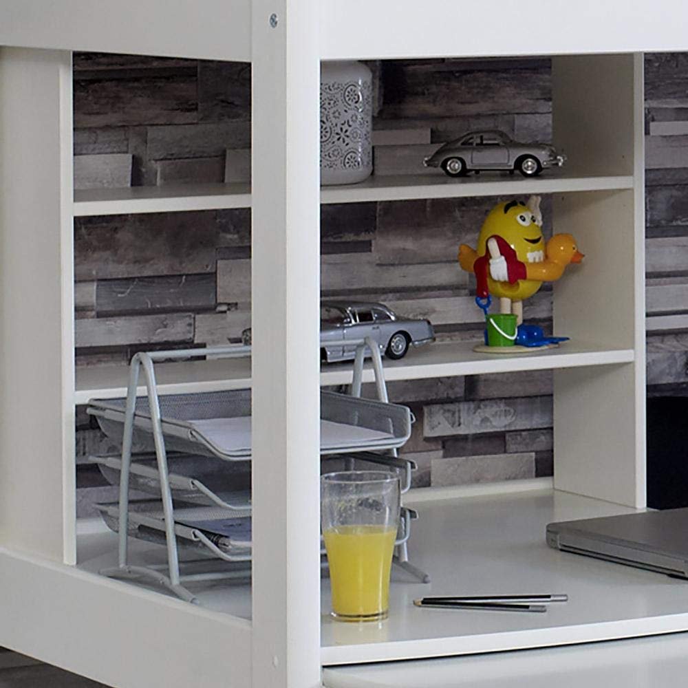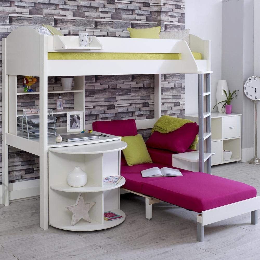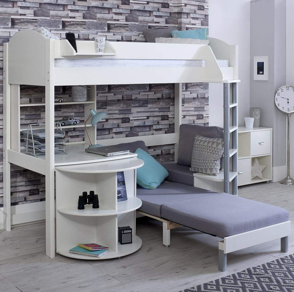 The Stompa Next Generation Casa 4 loft bed offers a place to sleep, relax and work. It features a rigid bedframe with sleeping bunk, with a pull out desk and sofa bed below. (NB: Can be set with ladder/desk on either end of the bed – “mirror image” to main picture). The top bunk is accessed via a tubular metal and wood ladder which can be set-up, along with the sofa and desk, on either end of the bed, as required. The bedframe is made from solid Scandinavian pine with white finish, and the header and footer boards are made from modern MDF. The sofa bed is what makes this so special – the comfy sofa, with it’s big cushion set, can fold out to a full-sized futon style bed when needed – great for unexpected company. The sofa bed then simply folds back up into a comfortable mini-sofa for relaxing on. There’s even a small side table at hand. Some great detail – there’s even some hidden storage below the sofa to keep the extra bedding in when not in use. Beneath the bed is a fixed surface with pull out desk below. Ideal for work or study, the desk pulls-out and tucks away neatly as required. Great for putting a computer or a TV on – it has a series of stylishly designed shelves on the end. The underbed shelf adds extra storage above the fixed desk. You also get some hidden storage shelves that are revealed when the desk is pulled out. This bed requires a standard continental single mattress measuring 90 x 200 cm, available separately. NB: It is recommended for all elevated beds that the maximum depth of any mattress for the top bunk is 15 cm.