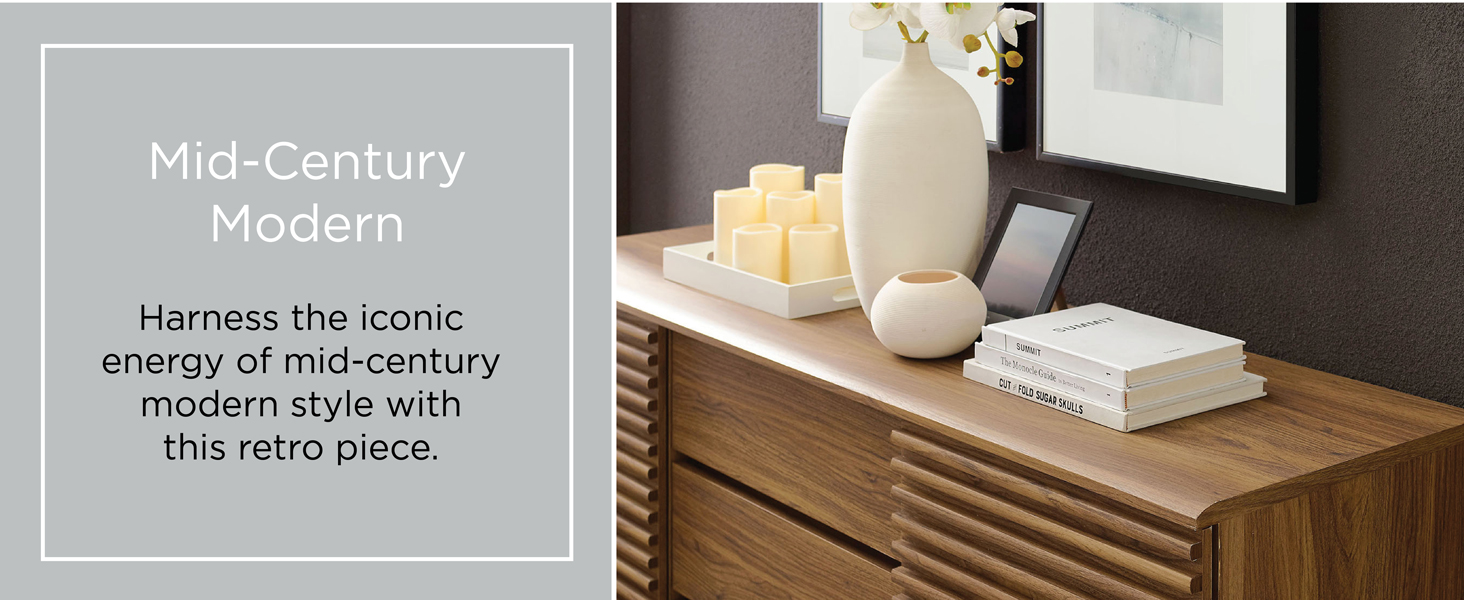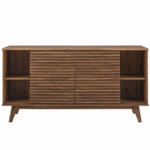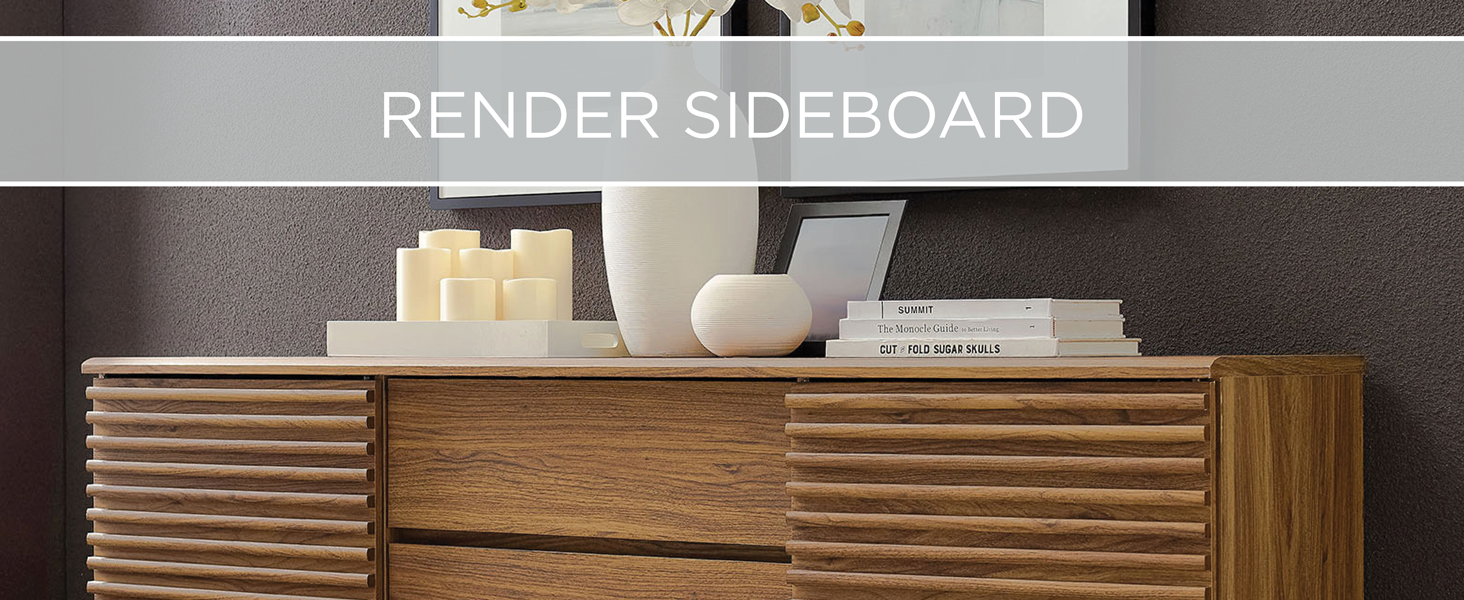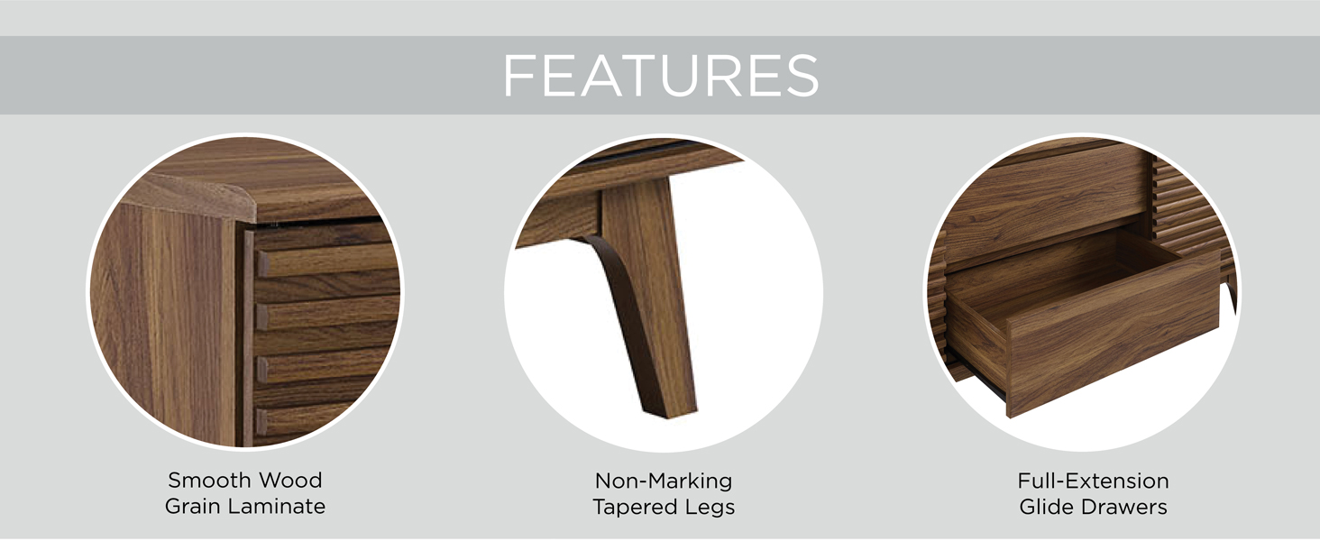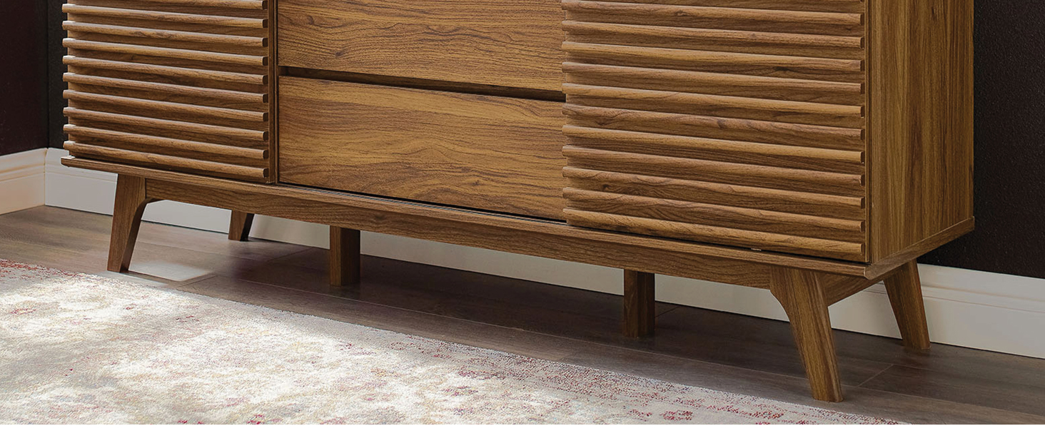 Tap into mid-century aesthetics With the render sideboard buffet display stand. This dining room buffet table features a durable particleboard frame with smooth Walnut grain laminate, four tapered wood legs, an adjustable shelf on both sides, three center full-extension glide drawers, and two sliding doors for easy access to shelf storage. Render features an abundance of storage for your silverware, dishes, and other dining room finery. Boasting a mid-century modern style this accent table features a solid construction with a pleasing look and practical functionality. Perfect as a sideboard, credenza, storing and serving buffet table, and display stand, transmit also accommodates flat-screen TVs up to 70” wide as a living room or lounge area TV stand.