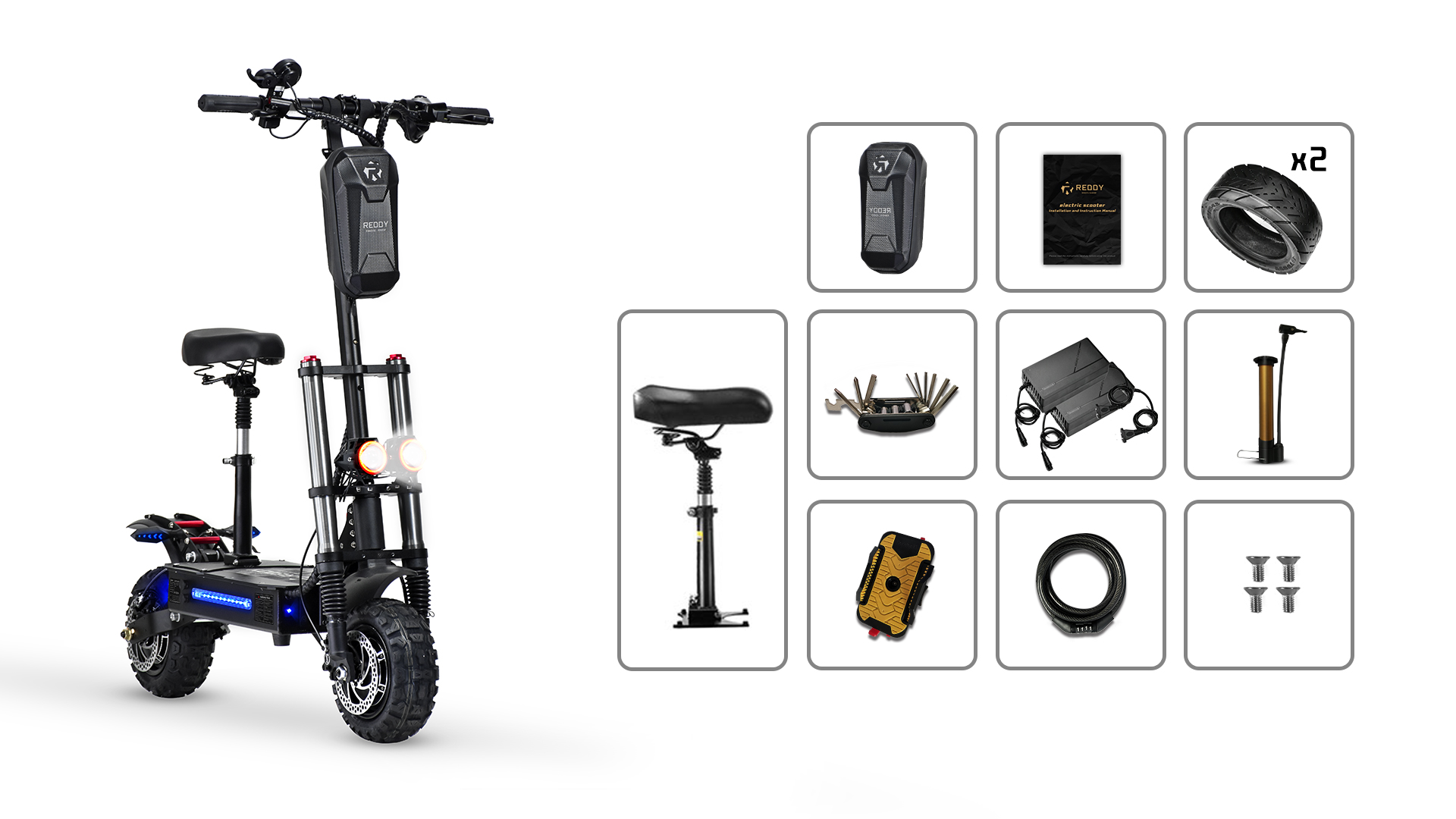 REDDYDY electric scooters are waterproof with IPX-5 rating. Voltage key lock: The key starts the electric scooter and can display the battery voltage in real time. Better protection for the battery and longer service life.