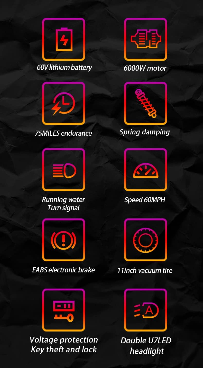 Dual drive, single motor 3000W, total power 6000W, super motor. Maximum speed is 60 MPH. Plenty of power for all your speed needs. Maximum load capacity is 800 lbs. Handles 45° steep hills with ease and is equipped with road tires, making it the ideal commuter electric moped for adults