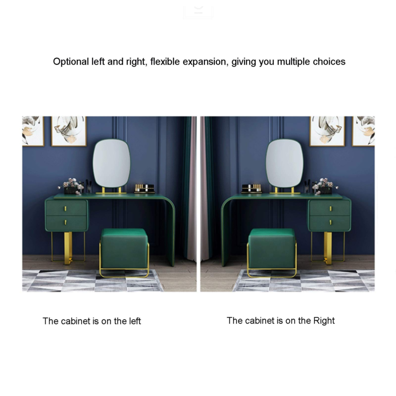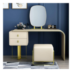 Irregular fashion geometric shapes and golden metal frame wall mount mirror, which you can decide the height of the mirror and is very helpful when you do make-up and style. The dressing table and stool are very well matched and a real eye-catcher in your bedroom.