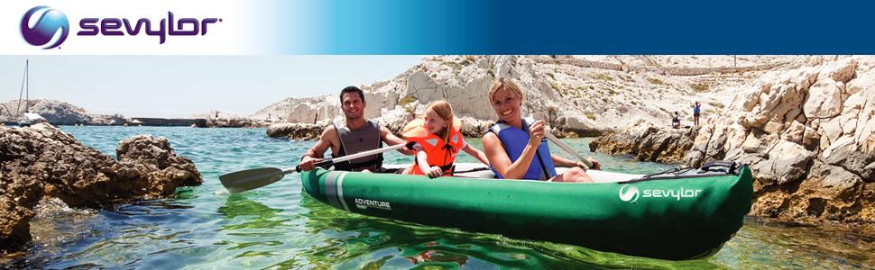 Sturdy kayak for two adults and one child, ideal for lakes, fishing and sea shores, broad shape combines stability and comfort when out on the water, integrated large spray decks at bow and stern