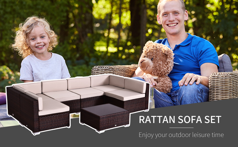 Brighten your patio area with our 7-Piece Cushioned Outdoor Rattan Wicker Sofa Set. This high-quality rattan sofa furniture in stylish design is the affordable alternative to couch or chair. High quality galvanized steel frame and PE wicker, washable cushion cover which is assembled with zipper. The tea table has tempered glass on its surface. Our 7 Piece furniture set well creates an inviting setting you will want to use year after year!