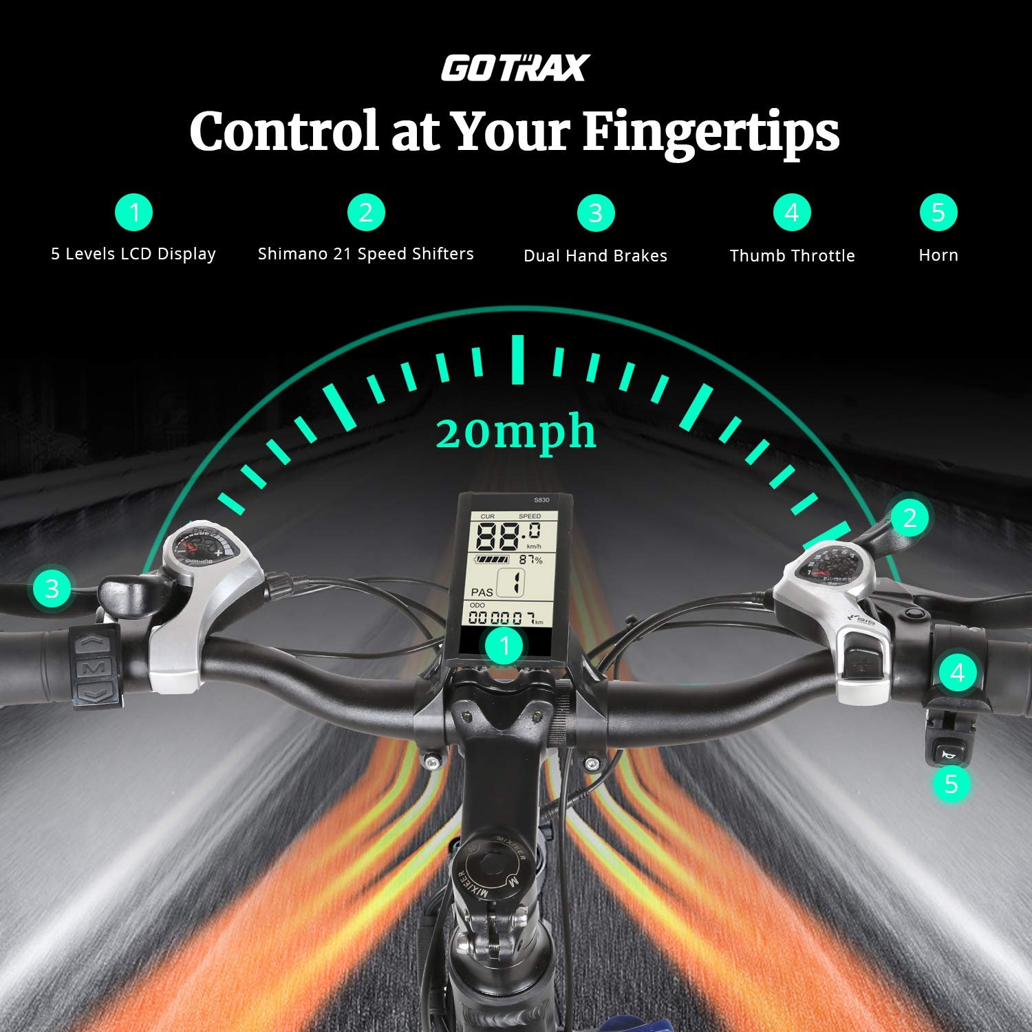 - TRUST WITH TOP COMPONENTS: Shimano professional 21-speed transmission system ensures reliability and durability. Dual disc brakes and electronic anti-lock braking system ensure riding safely. New Design the horn and the bright LED headlamp are equipped for safe night riding.