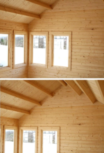 Wall thickness: 1-3/4″ (44 mm) – dual T&G wind block pattern | Front / back wall height: 7’3″ – Ridge height: 11’11”