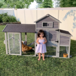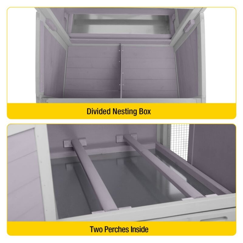 Chicken house with a 2-section nesting box makes it easy to deposit and collect eggs. The Metal Pull out tray collects droppings and waste, making this coop easy to clean.