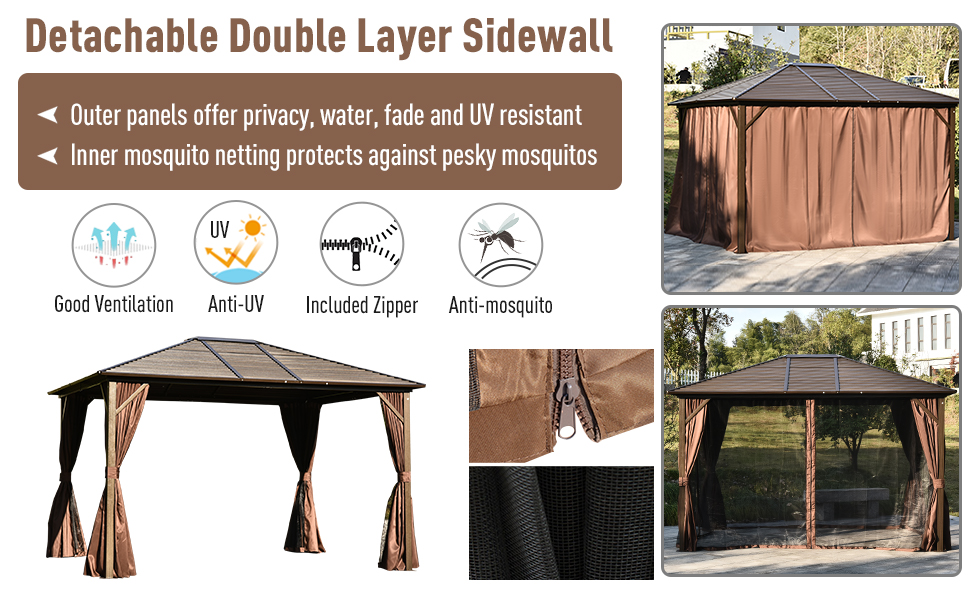 DOUBLE LAYER CURTAINS: The 10×12 gazebo for patios comes with removable curtains to ensure comprehensive UV protection and provide genuine privacy, while the mesh sidewalls with zippers keep good ventilation and small animals out. The outdoor gazebo brings truly leisure time.