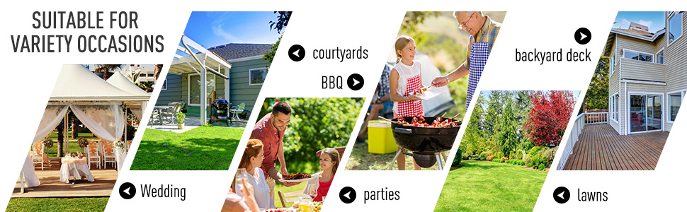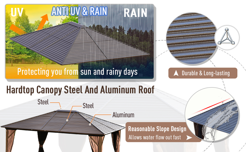 LASTING DURABILITY: Our gazebo canopy consists of equipped with a steel slat roof and strong aluminum frame. The built-in ceiling hooks can be used for hanging lights and fans. The reclined roof prevents water from accumulating for all-season use.
