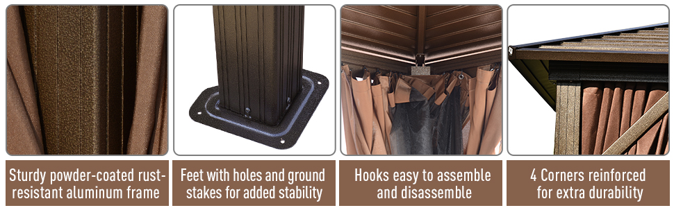 STURDY ALUMINUM FRAME: The powder-coated aluminum frame of the outdoor gazebo is not easy to scratch, peel, or rust. While being strong, it’s lightweight and easy to carry. The included ground stakes help stabilize on the ground to stay firmly in place for seasons.