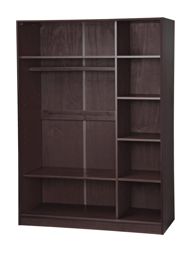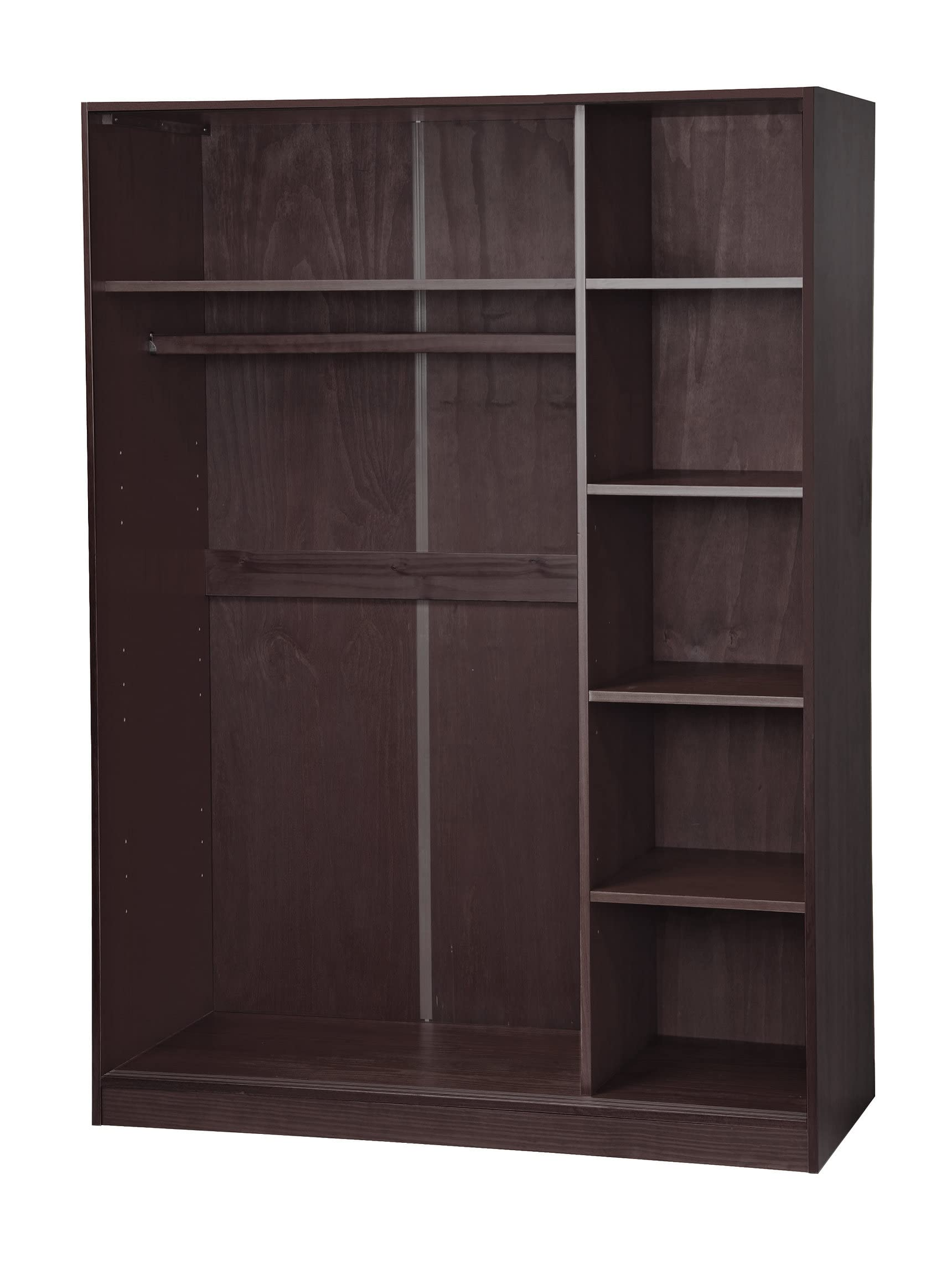 A very large wardrobe that stores a lot on a small footprint! With the sliding doors, no precious extra space is needed to open them. Fully customizable, you have total control over the wardrobe’s configurations by changing its layout to fit your needs: up to three full shelves can be added, up to three small shelves can be removed and each removable shelf has three adjustable positions. You can choose from raised panel doors in Honey Pine or Mahogany colors or louver doors in Java color. The doors slide on two tracks and only one opening is available at a time. The wardrobe’s functionality is enhanced by the aesthetics of the all wood construction.