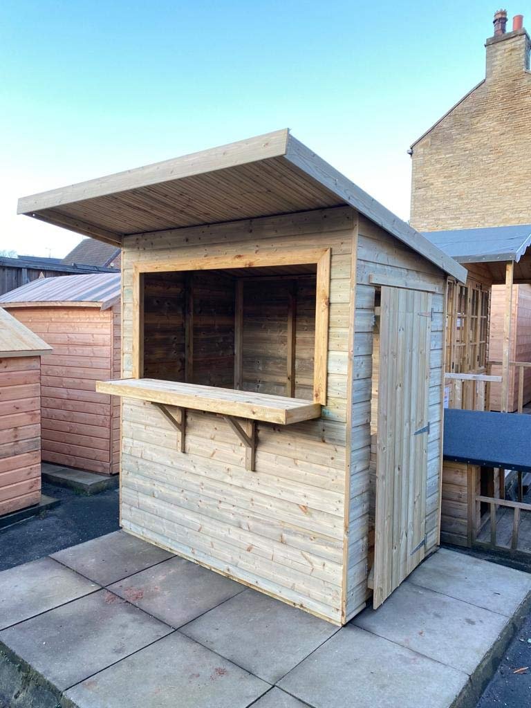 This Pinelap garden bar is 6ft x 4ft in size (or 6ft x 6ft if you include the front roof overhang). Manufactured using quality tongued and grooved cladding on a strong internal timber frame. Practical but sturdy, durable and long lasting for use year upon year. Each cladding board is double nailed using ring nails for strength, it has a locking door and removable locking shutter. Complete with serving shelf and strong internal uprights that shelving can be added to.