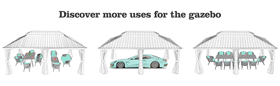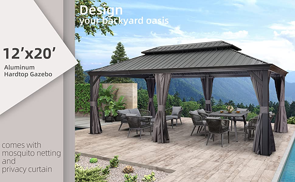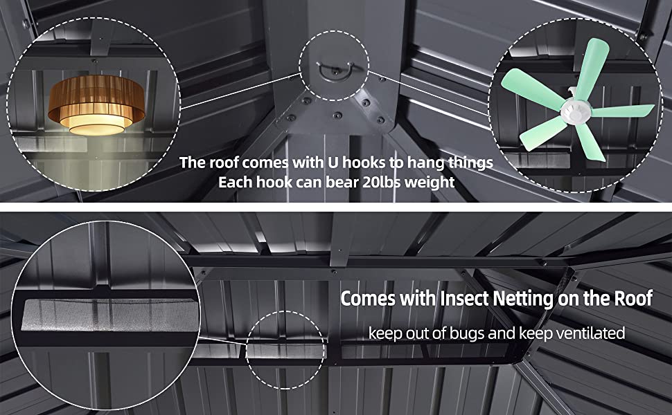 Size: 12′ X 20′. Fade-resistant and rust-resistant galvanized steel top, keeps out bright light and harmful UV rays, makes this hardtop gazebo strong enough to withhold heavy snow.