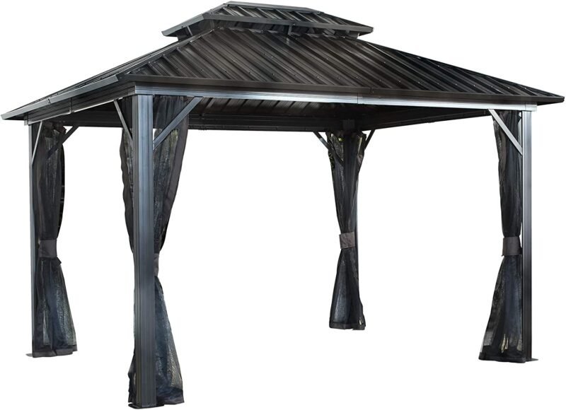Overall Dimension:12’ L x 16’ W x 9.76’ H. Double roof made of galvanized steel can give you shade or rain protection in outdoor activities.Double track design can not only install a curtain but also install a netting, which can meet all weather use. Enjoy your outdoor life: Outdoor gazebo can provide enough space to place patio furniture and your BBQ grill and you’ll be relaxing under the shade of this gazebo!