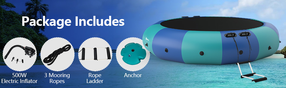 【Complete Accessories】 To get you ready for a pleasant and safe water bouncing experience, we provide a 500W electric inflator, a rope ladder, 3 mooring ropes and an anchor in the package. You can fill the anchor with water or sand and fix it on the trampoline for increasing stability on water.