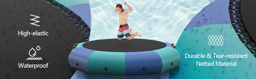 【Durable & Weather-resistant Material】 Our water bouncer is built to provide a long-lasting outdoor fun. Instead of metal springs, it selects high-quality elastic bands together with durable nylon cloth that are more suitable for outdoor water environment. Meanwhile, the colorful parts are made of heavy-duty PVC material, which features puncture-proof and weather resistant quality.