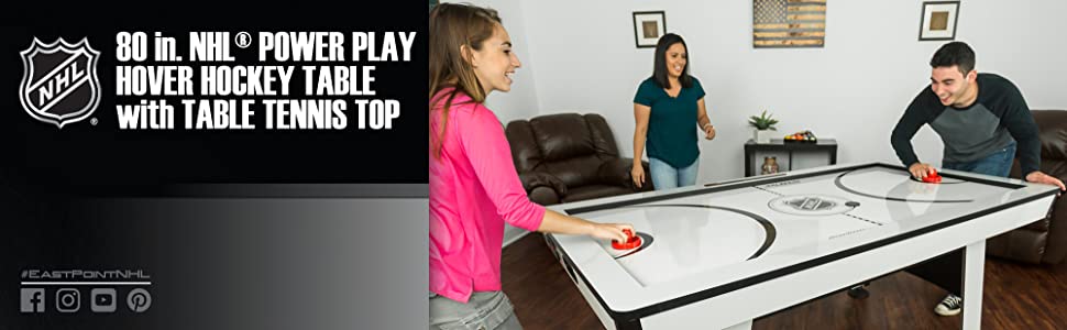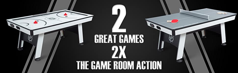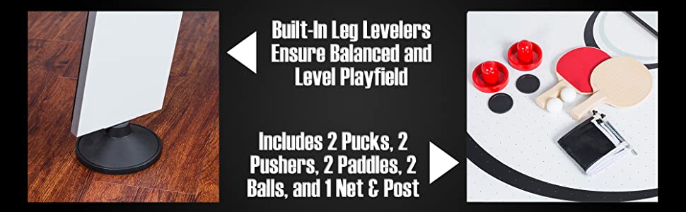 SET INCLUDES: (1) Air Powered Hockey Table, (1) 3-piece table tennis conversion top (80”x43”), (2) Pushers, (2) Pucks, (2) Table Tennis Paddles, (2) Table Tennis Balls, (2) Steel Chrome Plates, and (1) Net and Post System