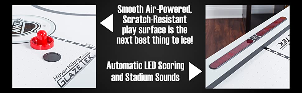 LED SCORING SYSTEM: In-Rail LED Automatic scoring and sound system adds convenience and design to the Power Play Hover Hockey Table Model