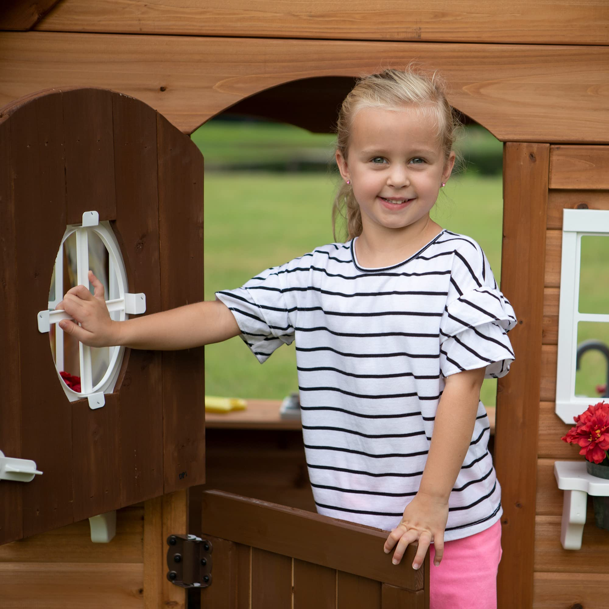Brilliantly designed with 100% all natural cedar wood. Decorative white gable triangles, white windows, flower pot holders and a working dinner bell are all included. The outside of the playhouse encompasses a working door with an oval overhead door window. For over 30 years, Backyard Discovery has been producing the highest quality wooden swing sets, playhouses and backyard leisure products for the home. Our team of innovators and specialists are passionate about bringing our love of quality family moments to your backyard. We are everyday parents just like you, while also expert craftsmen with a long legacy of building great products for millions of customers. We strive to take kids outside (just like we were) where they can flex both their muscles and their minds.