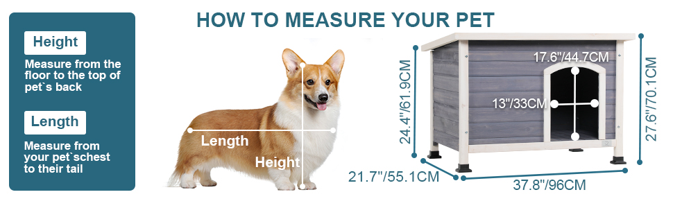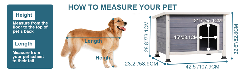【Large Outdoor Dog House Suitable for Medium to Large Dog Breeds】Our large dog house measures 42.5”L x 23.2”W x 32.6”H/28.8”H and the interior is 41.1”L x 25.5”W x 26.4”H/23.5”H. It is ideal for medium to large dog breeds w/ an adult weight up to 80 pounds.