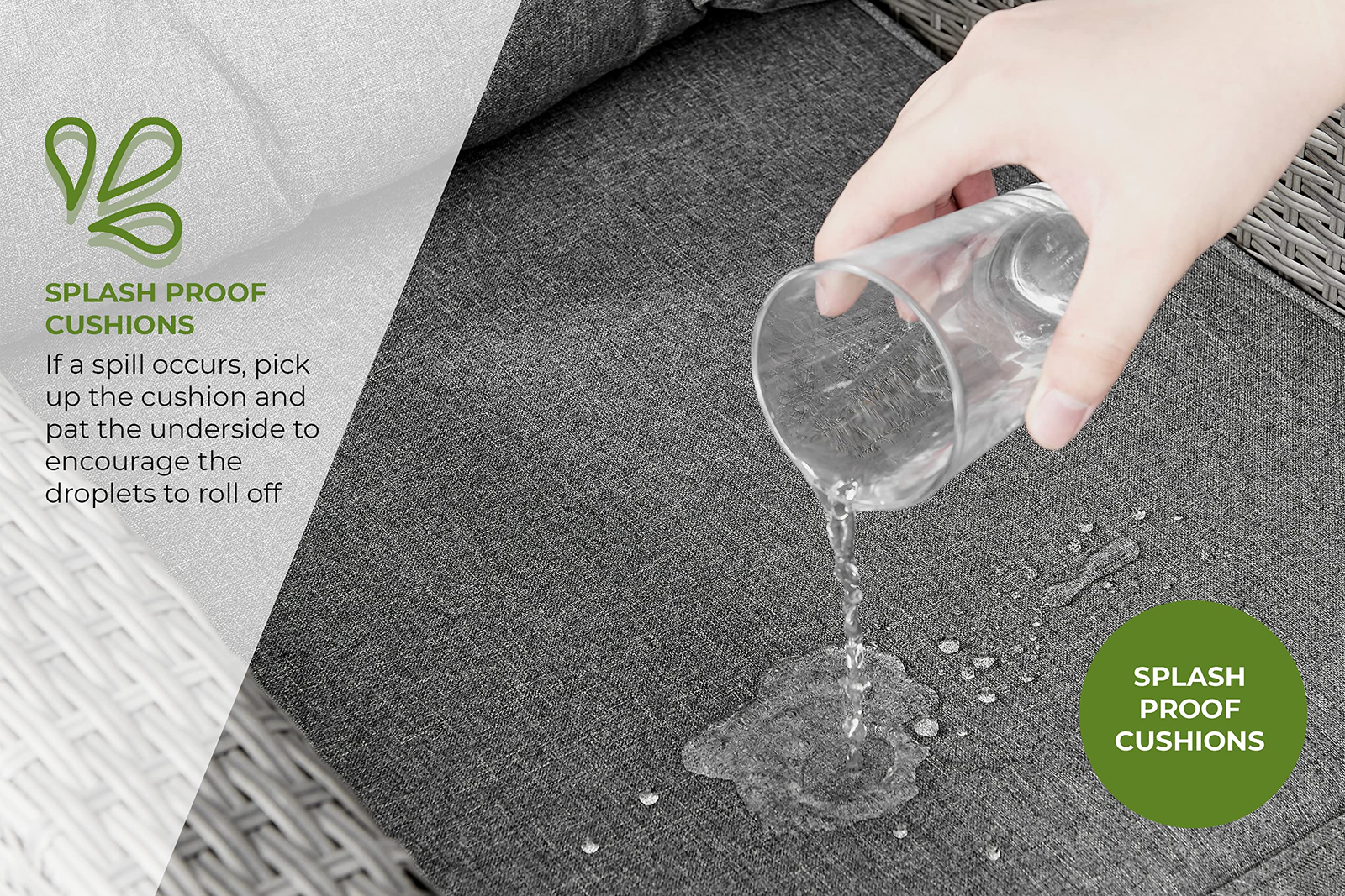 The cushions are splash proof allowing any spills to roll off and the covers can be easily removed for washing.