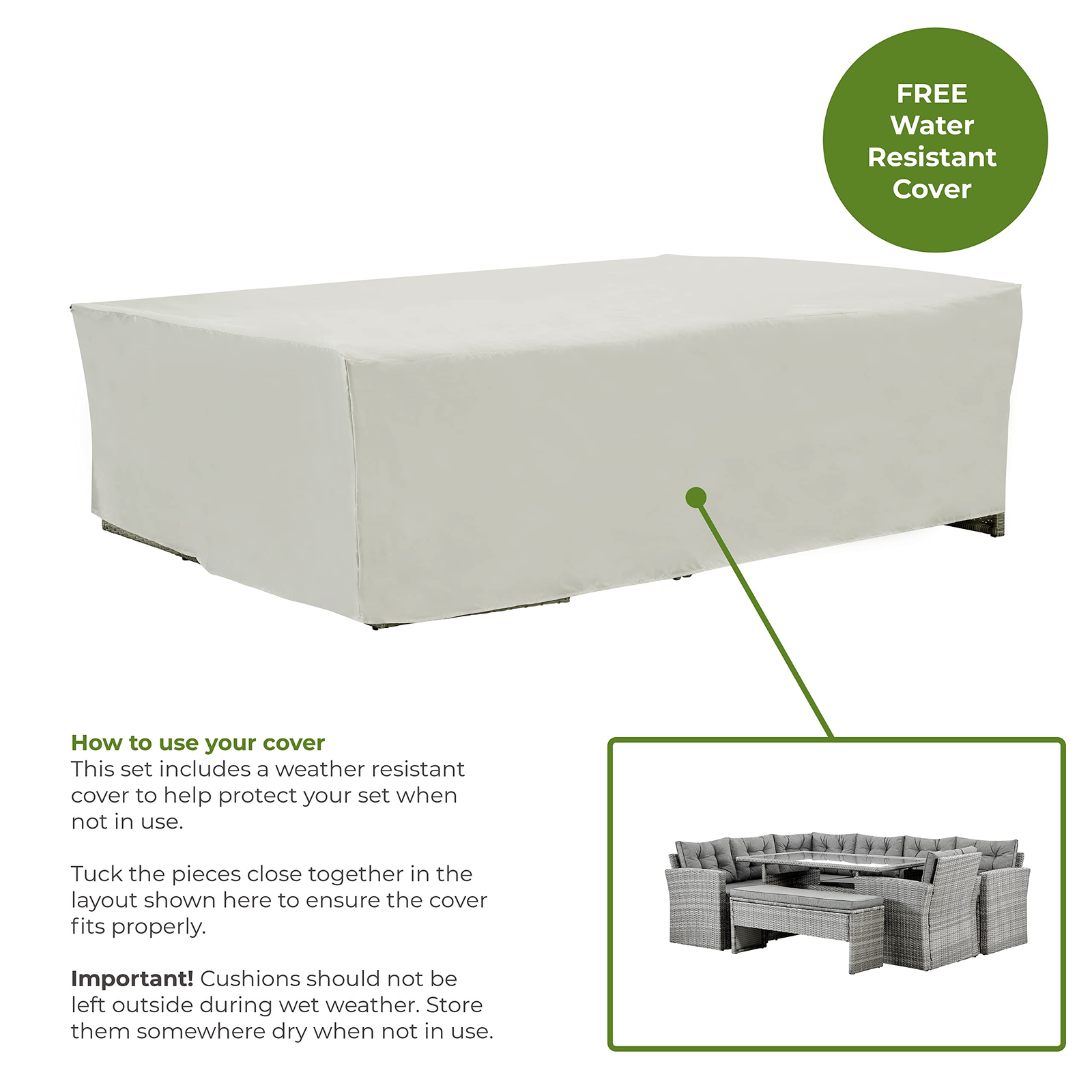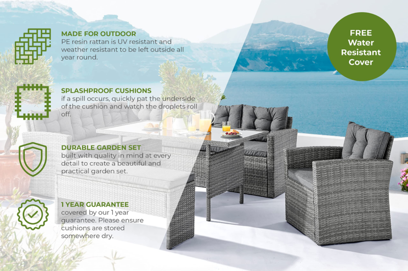 But it’s not just about looks. This set is built to last. Crafted from high-quality grey rattan, it’s weather-resistant and ready to face whatever Mother Nature throws its way. Spilled drinks? No problem! The cushions are easy to clean, so you can spend less time worrying and more time enjoying the party.