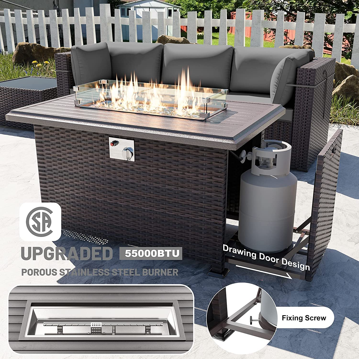 LUXURY COMBINATION:Kullavik patio conversation set includes 4 corner sofas ,8 middle sofas with Cushions , 2 tempered glass tables, propane fire pit table with glass wind guard,A set of grey cushions and a set of sand cushions,fire glass,slide out tank holder,lid, table cover.You can easily put them together according to the instructions with all included necessary tools and hardware. Please do not tighten the screws until you align all the holes of the wicker chair.