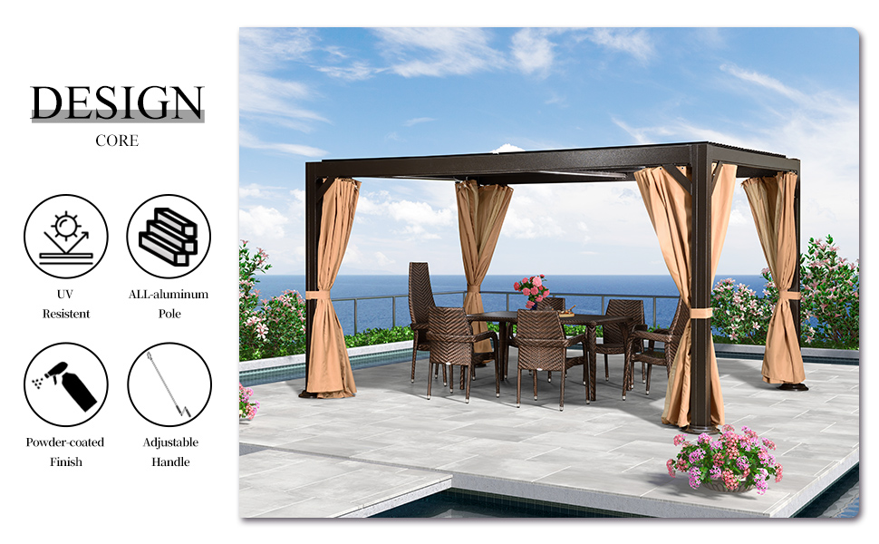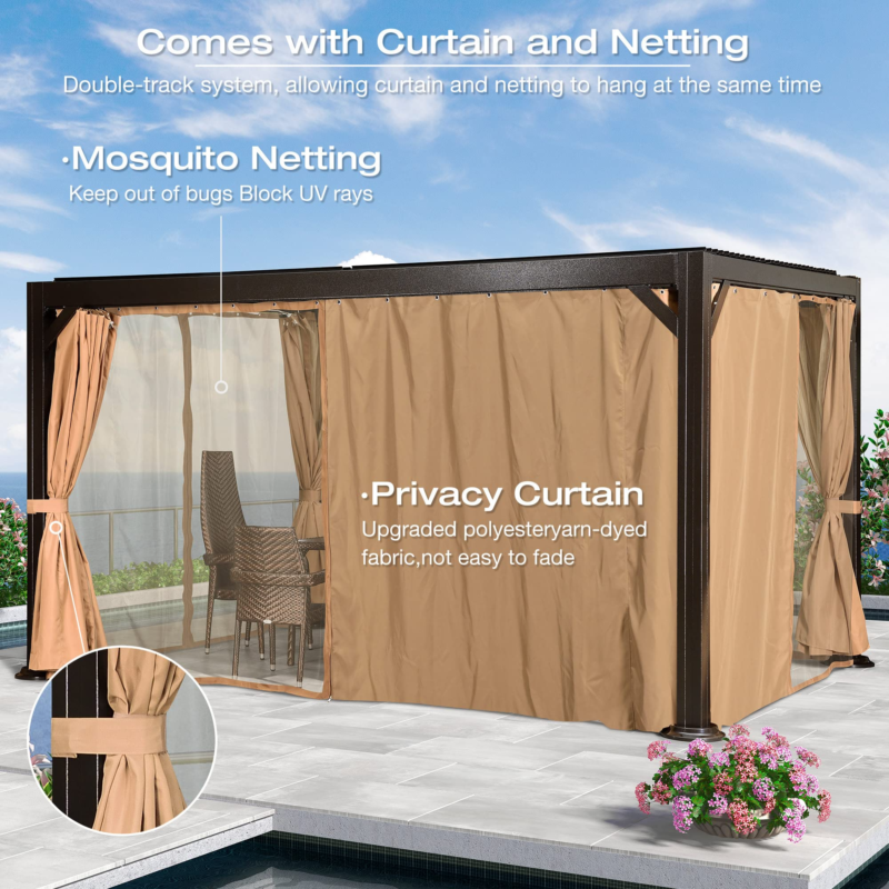 The removable privacy curtains and netting are included which helps keep bugs out of the gazebo and provide the privacy space. It is a dream louvered canopy for gardens, backyards, swimming pools, spas, beaches, terraces, decks, parties.