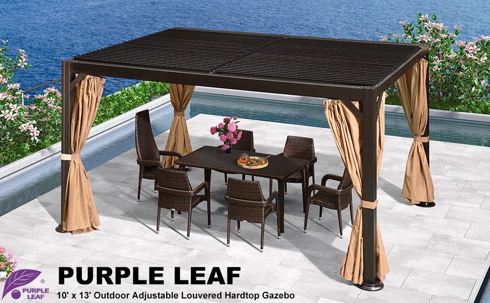 PURPLE LEAF Outdoor Adjustable Louvered Hardtop Gazebo is an updated of the traditional hardtop gazebo with adjustable louvered roof which can spin open to an angle of 90° and can spin shut to 0°. It is made of aluminum frame and galvanized steel roof, treated to be rust resistant and fade resistant that lasted for years. It is your best choice for outdoor gazebo.
