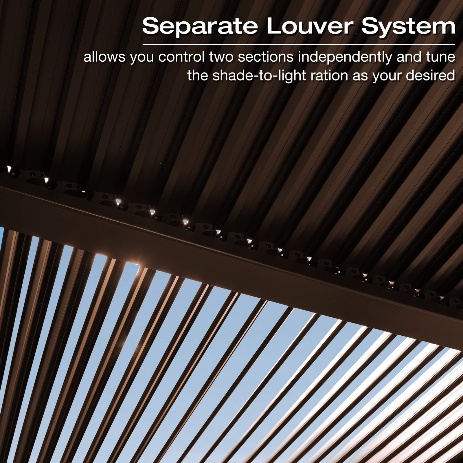 This louvered hardtop gazebo allows for customize shade in diffierent directions, offers the ability for full shade when the louver is tilt shut, keeps out bright light and harmful UV rays.