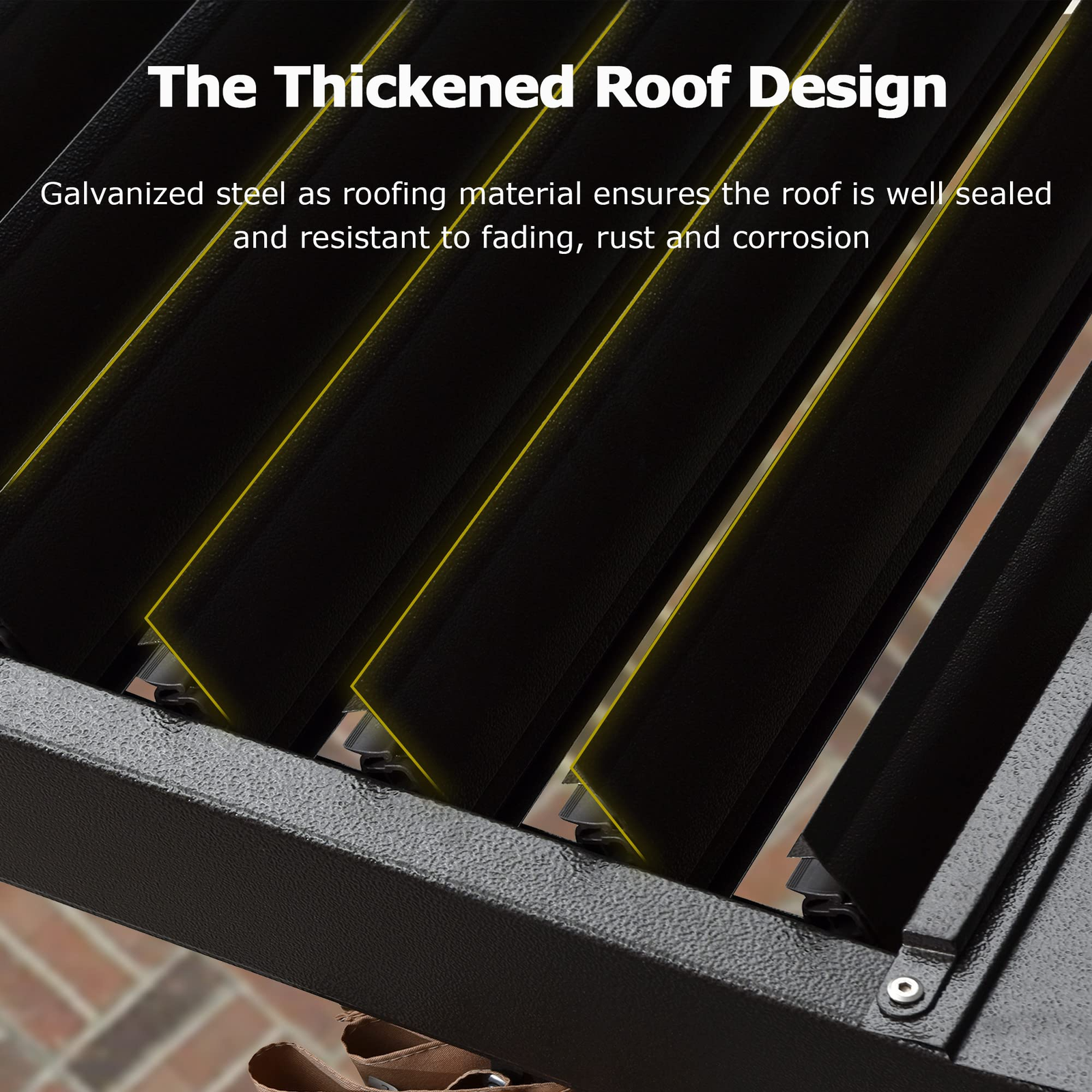 Composed of aluminum alloy frame and galvanized steel roof, rust and corrosion resistant, easy to clean. Water gutter design and special tilted structure ensure rainwater flows out of the edges of the frame and poles.