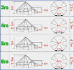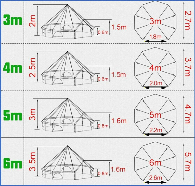 Good ventilation: there are four ventilation holes on the top of the tent. For the 3m and 4m bell tent, there are four semicircular windows. While for the 5m and 6m tent, it is four rectangle windows. All door and windows are mesh screen with zipped canvas flap.