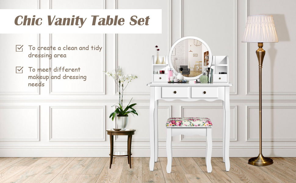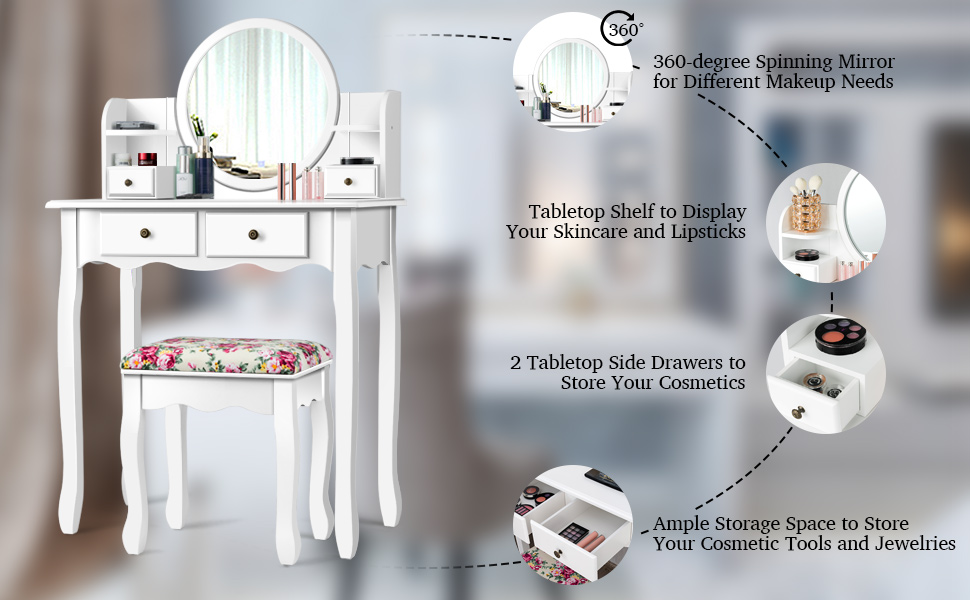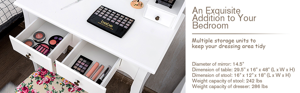 🌺Easy to Assemble & Clean: Comes with an clear installation instruction and all required accessories, the makeup dressing table set is easy to install in short time by yourself. The surface of this set is waterproof and scratch-proof. Therefore, the set can be cleaned with cloth conveniently.