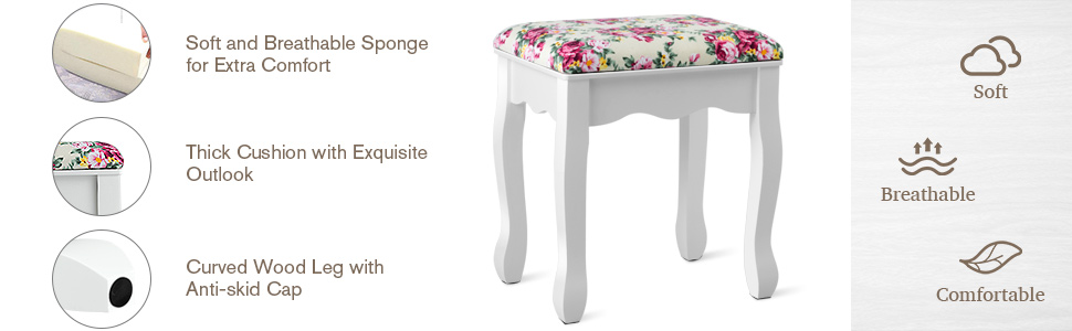🌺Soft Cushioned Stool: The thick padding with printing pattern is nicely bonding with the stool. And high resilience makes you feel comfortable when sit on this stool. At the bottom of the leg, there is a pad to prevent slip and scrap to the floor. And the stool also can be used separately as an ottoman, desk chair and so on.