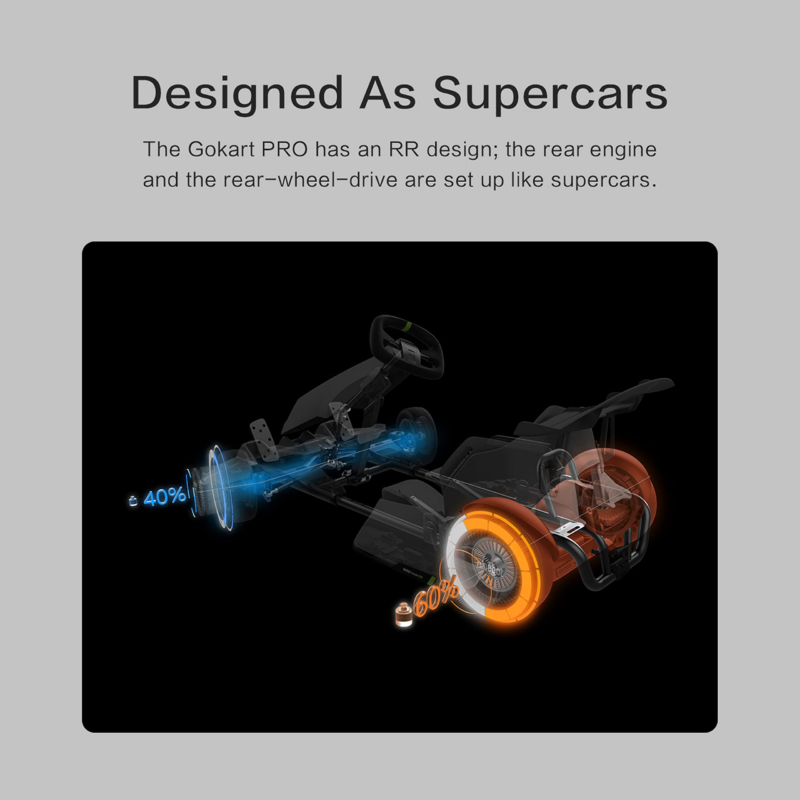 The Gokart PRO has an RR design; the rear engine and the rear-wheel-drive are set up like supercars. The weight distribution is designed with 40% front and 60% rear.