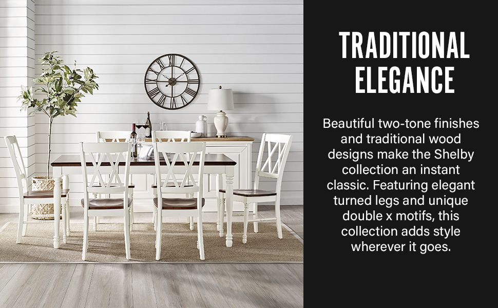 Ideal for an eat-in kitchen or dining room, the Shelby 7-Piece Dining Set was designed with tradition in mind. Featuring an 18″ drop leaf and classic turned legs, the dining table can expand to accommodate up to six diners. The open double x-back chairs provide comfortable seating, making the Shelby 7-Piece Round Dining Set the perfect spot for a family meal.