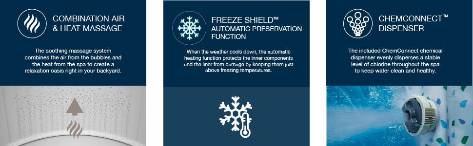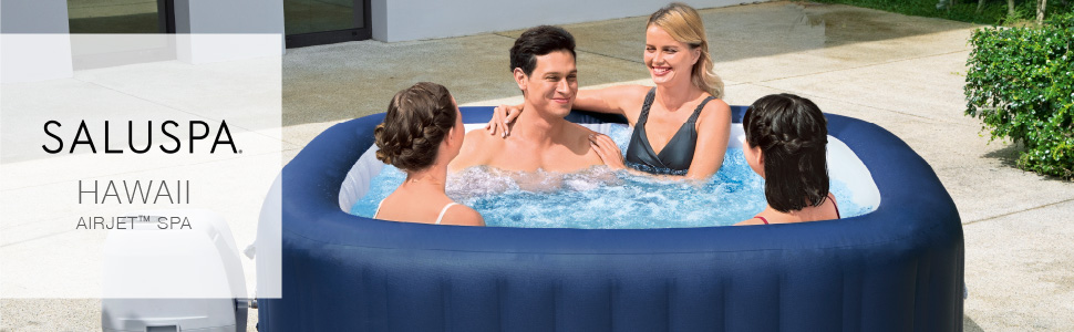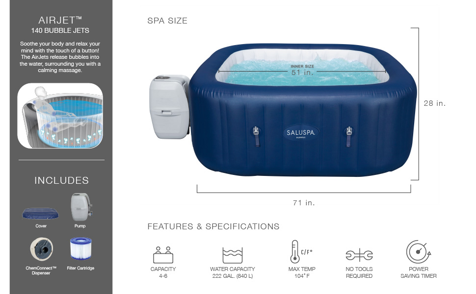 Simple setup and maintenance: no extra tools are needed to setup This portable spa. Simply inflate and deflate with the spa’s own pump! In addition, a reinforced cover with safety lock clips and built-in air chamber for heat insulation covers your spa when not in use.