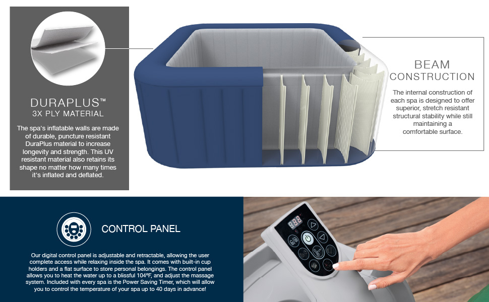 Operate from inside the hot tub: The digital control panel lets you change the water temperature (up to 104 degrees Fahrenheit) and flow of the jets without stepping out of the tub. A power saving timer can even automate the temperature of the spa up to 72 hours in advance; Cord length: 9 feet.