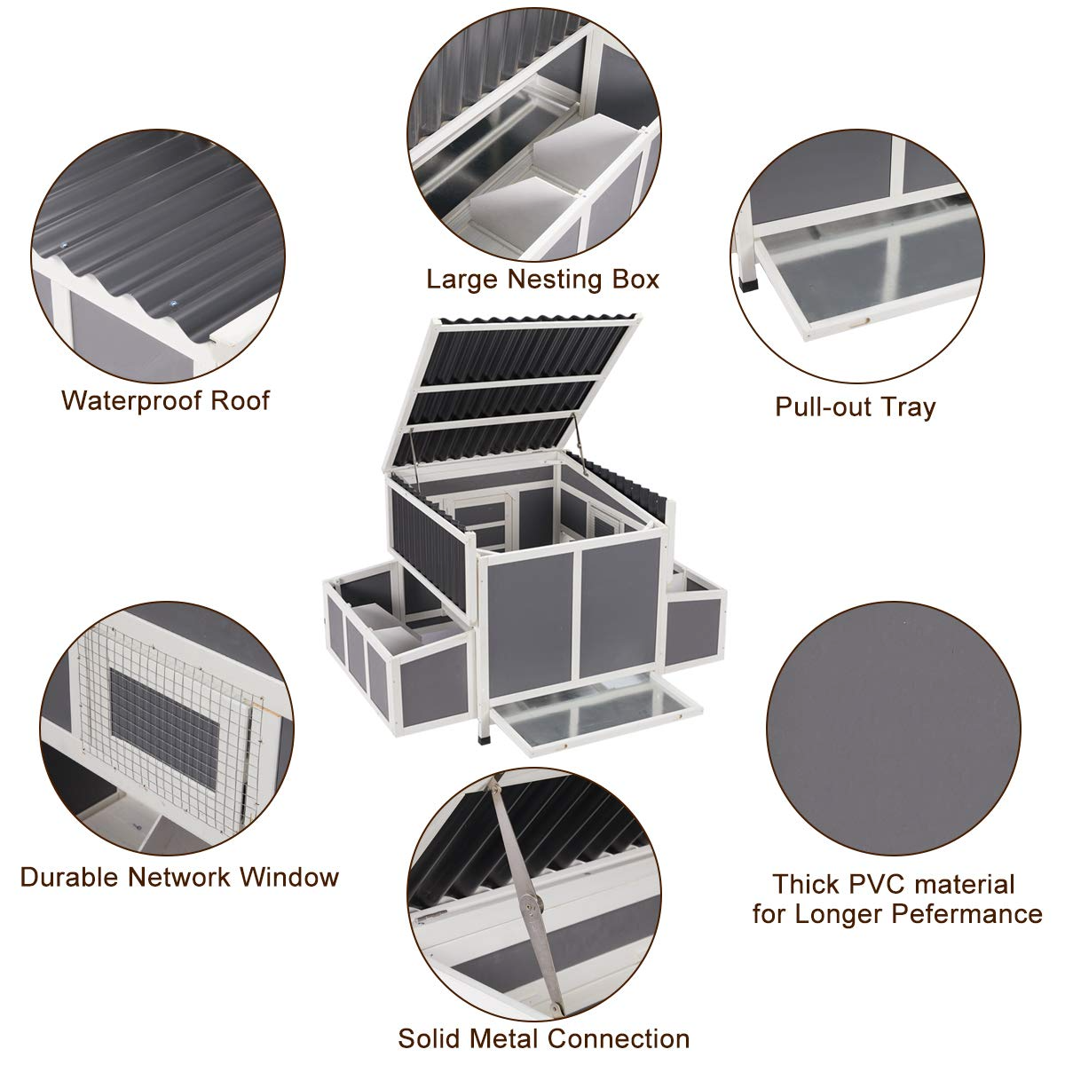 【Sturdy Construction & Stay More Than 2 Years】The animal hutch is constructed by wood and PVC,eco-friendly non-toxic varnish keep the poultry hutch waterproof and UV proof, sloping roof protect from water penetration, making the chicken house stay for longer time than regular chicken coop.