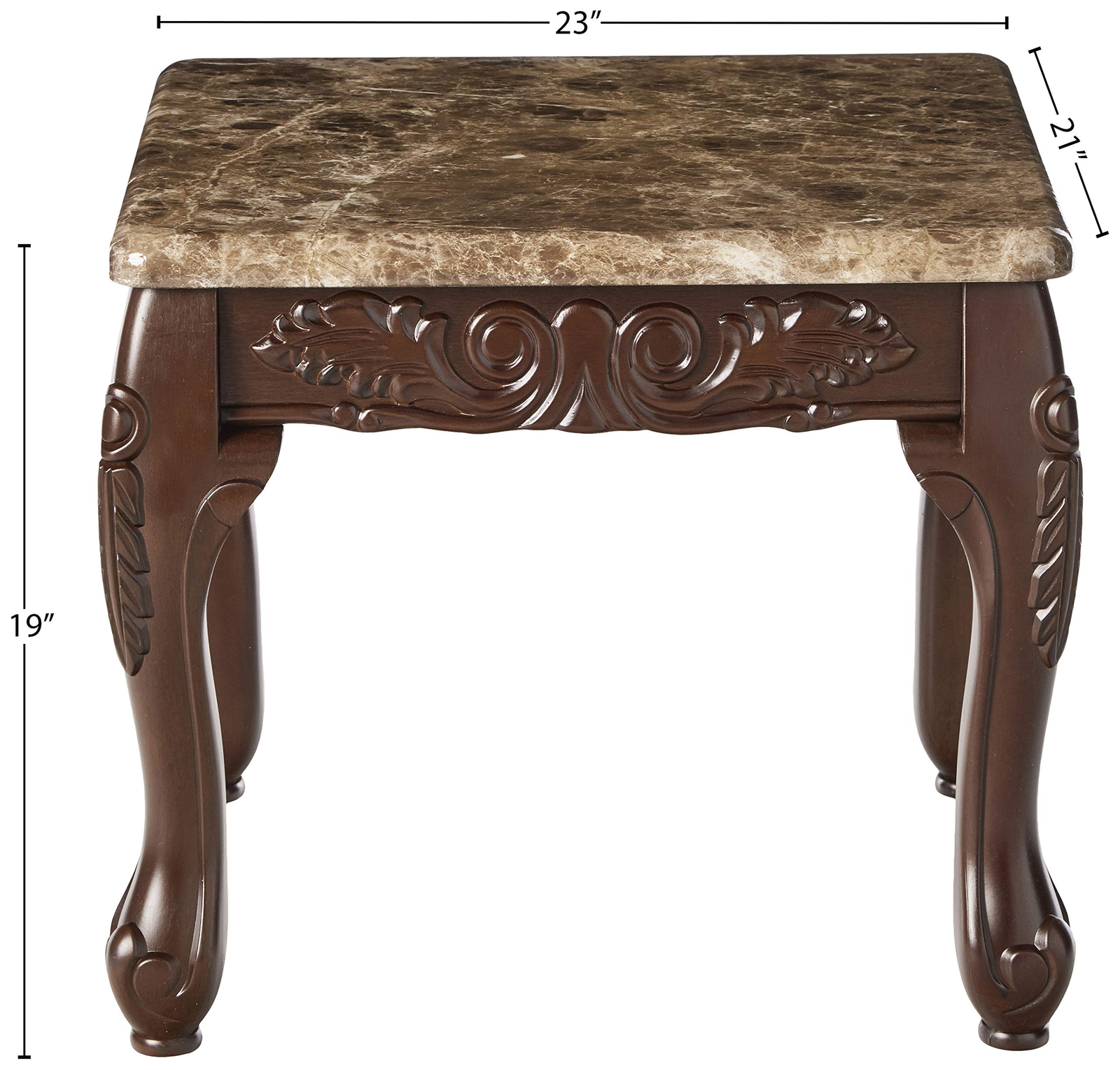 Traditional elegance sure to bring a touch of beauty to any home. These tables showcase gorgeous faux marble tops resting upon wooden Cabriole legs, accented with intricate carvings for visual appeal. The Dark Oak finish lends a natural luster.