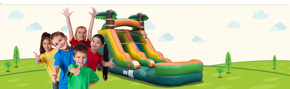 HEAVY DUTY: Forget about the tawdry offerings of competitors- we make our products with 100% commercial grade PVC Vinyl construction that is 5 times stronger than standard nylon residential inflatables, our jungle bouncy slide is built durable and strong for years of use. All high-stress areas are made of industrial strength, 15-ounce (0.45 mm) PVC heavy-duty, multilayer Vinyl with double to quadruple stitching. Quality truly meets excellence with our wet, fun inflatable products!