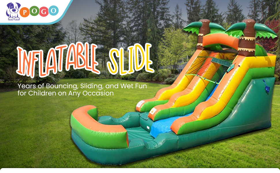EASY SUPERVISION: Not just built for mindless fun, the tropical oasis slide for kids is thoughtfully designed for ultra easy adult supervision! Featuring durable ripstop PC netting to help prevent unsafe sliding. It also features dual inflation tubes for easy setups! Drains in the splash pool keeps the water level safe and appropriate for children of all ages!