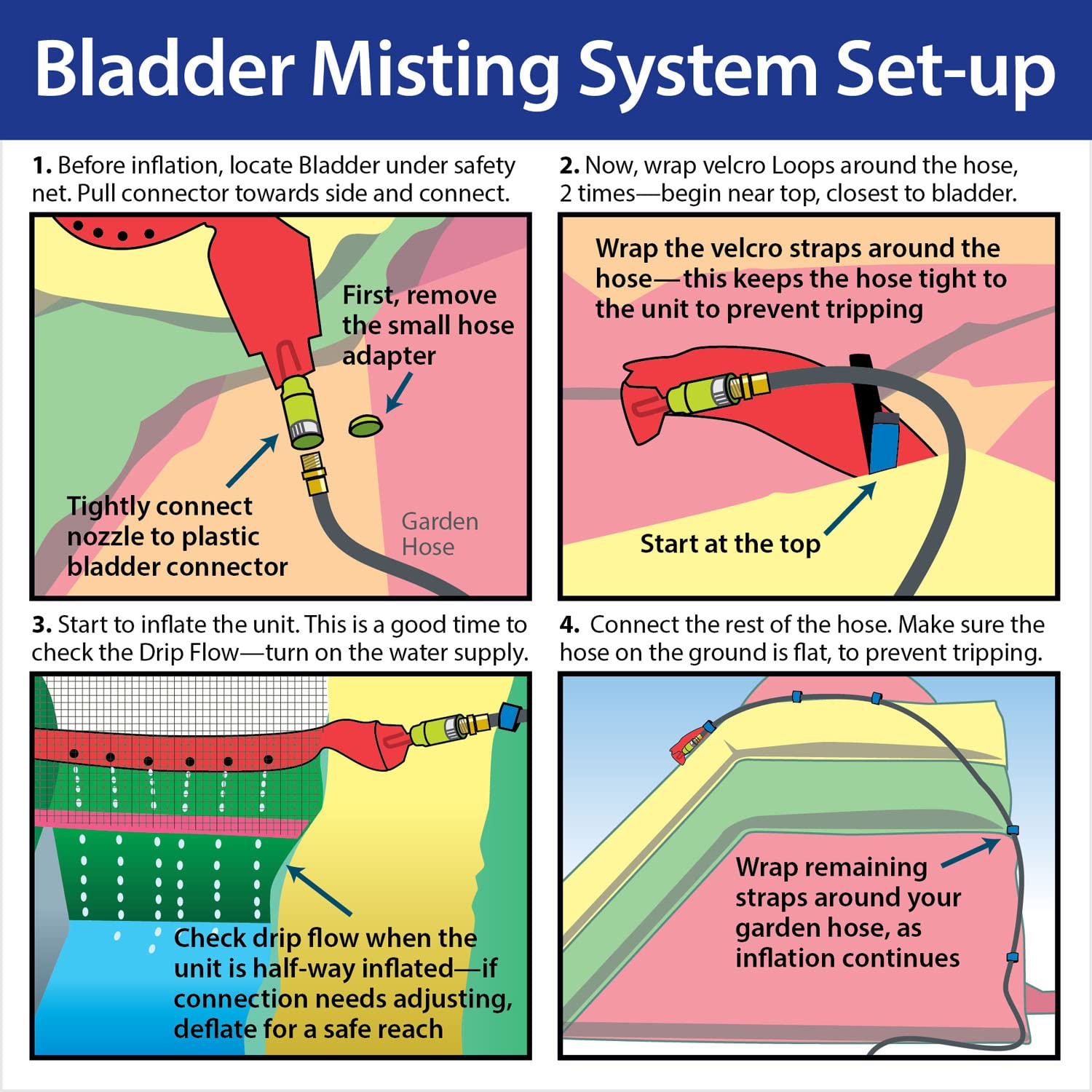 SPLASH ‘N SLIDE: With an easy-to-use built-in bladder misting system that fits standard garden hoses and a wet pool, our tropical oasis inflatable water slides provide super duper watery fun that inflates in only two (2) minutes! Add some splashy fun to a birthday or hot summer day!